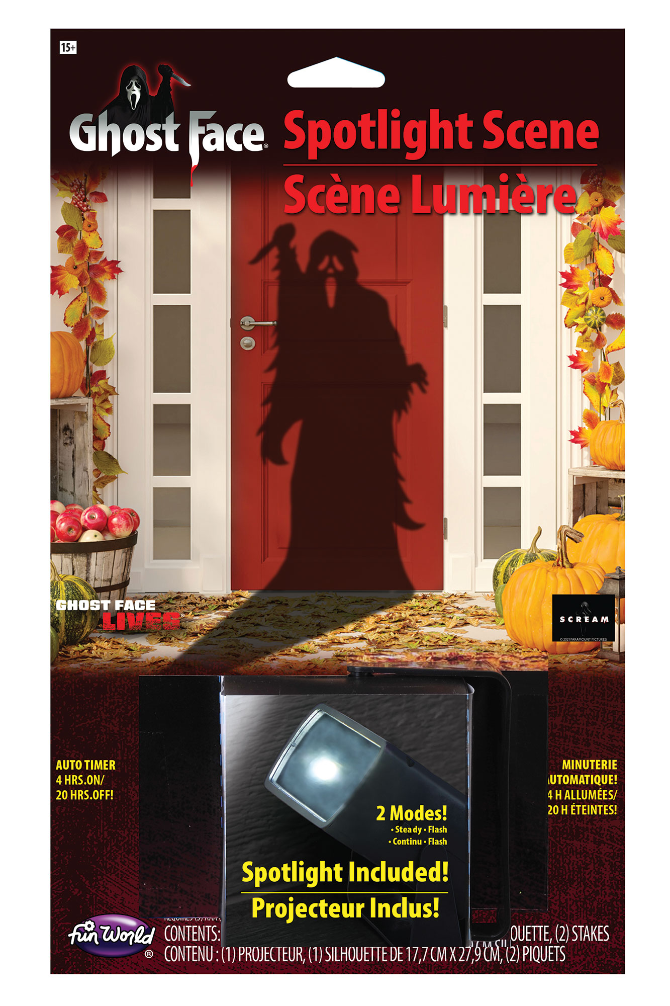 4 Pcs each: Witch; Scarecrow; Ghost FaceĀ®. Indoor/Outdoor Use.